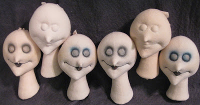 Here are the 6 heads with their necks on and 3 have their fabric skin on. The other white white heads will get their tan on soon.